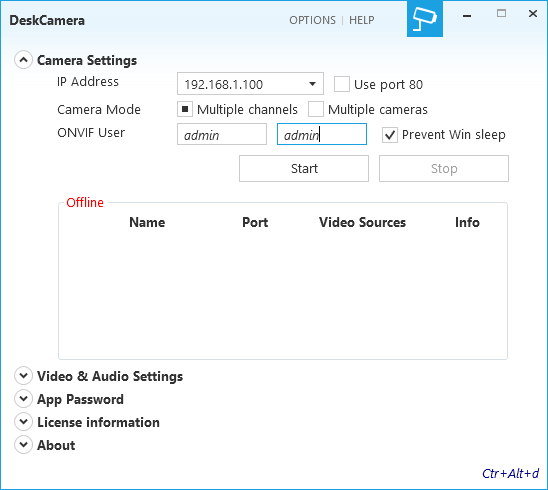 Once you have the DeskCamera software installed and running with a license installed, you’ll see the main configuration screen with the Camera Settings section opened. If you see any entries in the table or the Start button is deactivated, click the “Stop” button to kill the main RTSP services so we can configure your display sources. It should look similar to this when stopped: