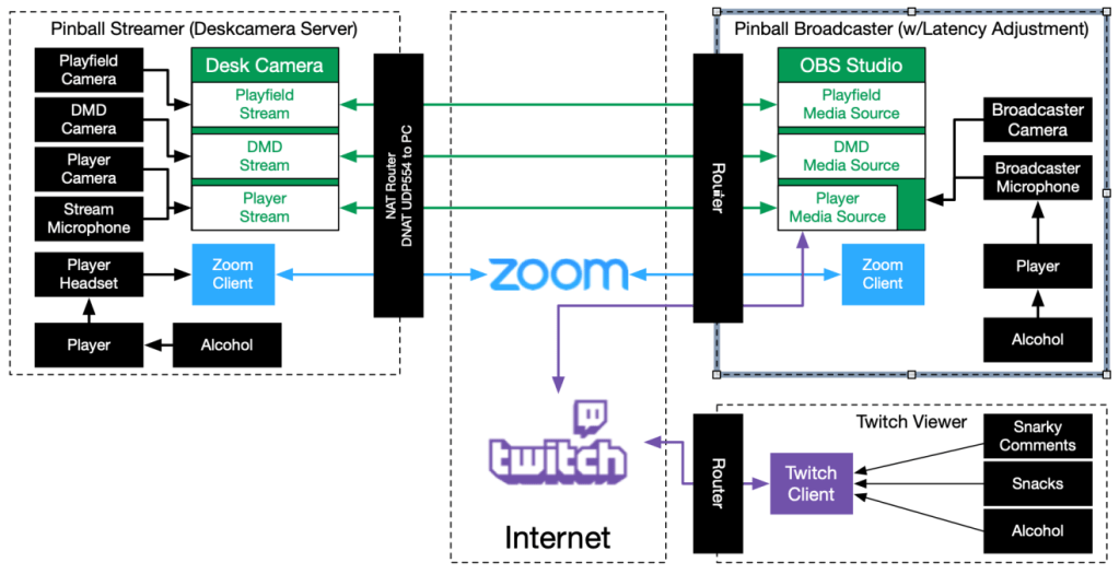 This newer process cuts out the middleman (Middlepeople? Middlepersons?) entirely and guests provide access to each individual component they’re streaming that the host can pull directly into their scene instead. These streams typically consist of the overhead view of the pinball machine’s playfield, DMD/LCD, and the player facing camera plus guest audio, each as a separate stream.